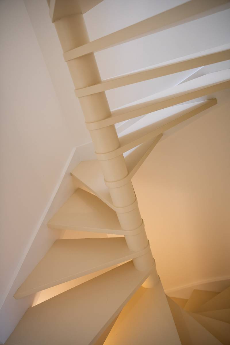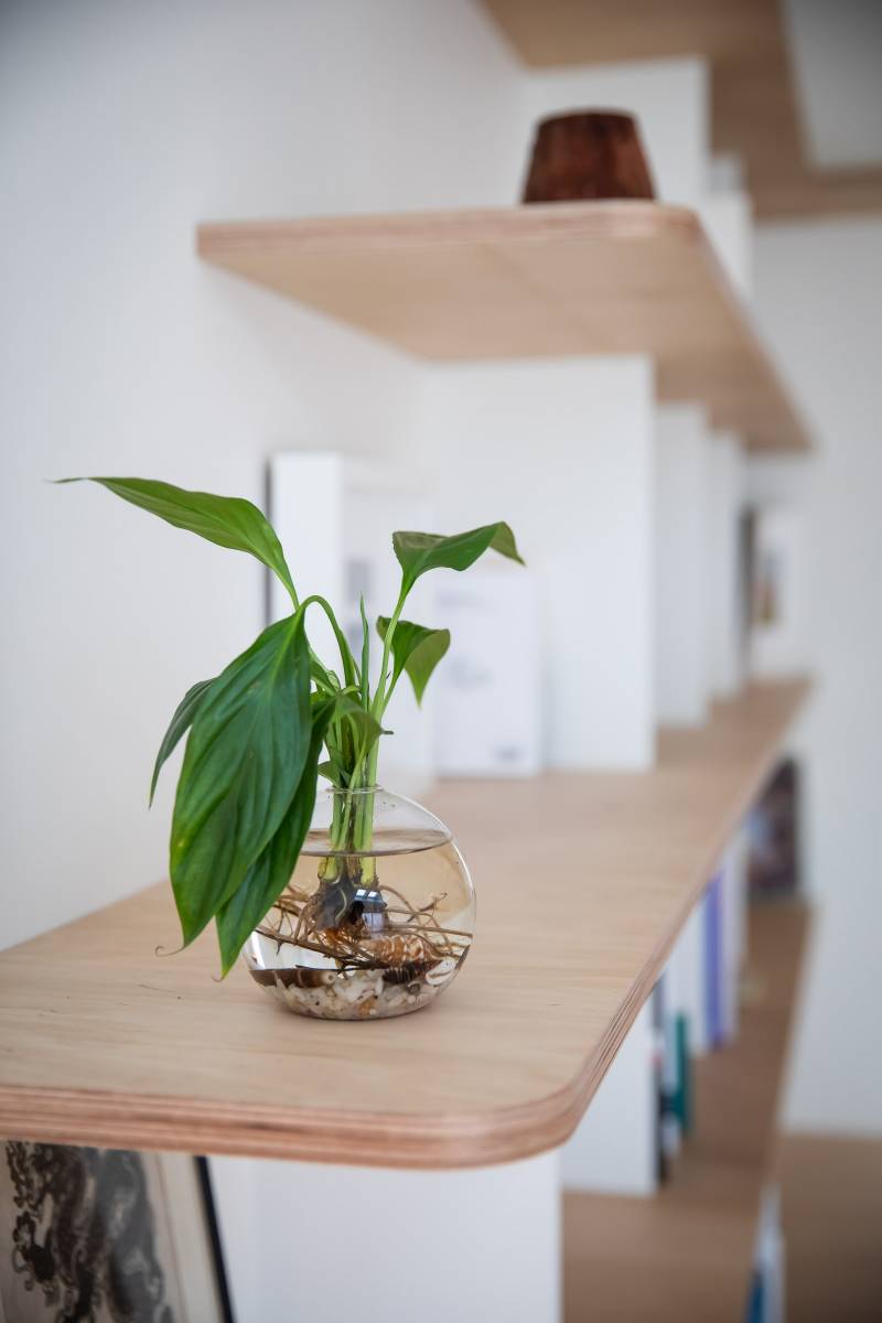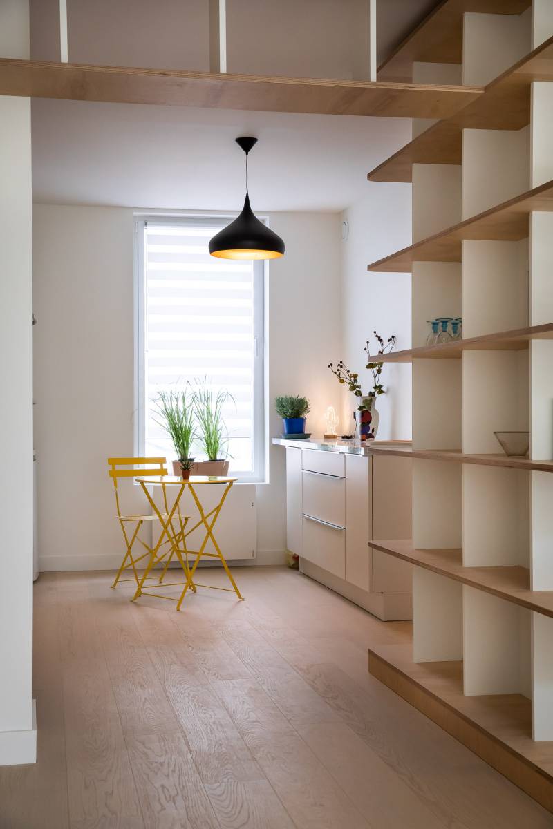 Le souhait de la cliente de pouvoir aménager ponctuellement son atelier de peinture dans la pièce de vie et d'imaginer un espace facilement transformable, nous a amené à réorganiser entièrement le rez-de-chaussée pour créer un grand volume bénéficiant d'une lumière traversante Est Ouest. Dès le démarrage des travaux, plusieurs éléments tels que la cuisine, les penderies et une verrière ont été soigneusement déposées pour récupération. La cuisine et les penderies ont été réemployées dans la nouvelle configuration; la verrière sur un autre site. L'isolation thermique a été améliorée et la pose d'une combinaison de trois châssis de toit a permis un nouvel apport de lumière naturelle dans la pièce de vie. La bibliothèque intégrée, se déployant de l'entrée au salon, est l'élément de liaison entre les différentes zones.