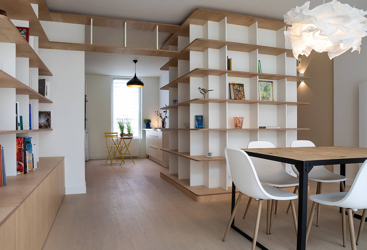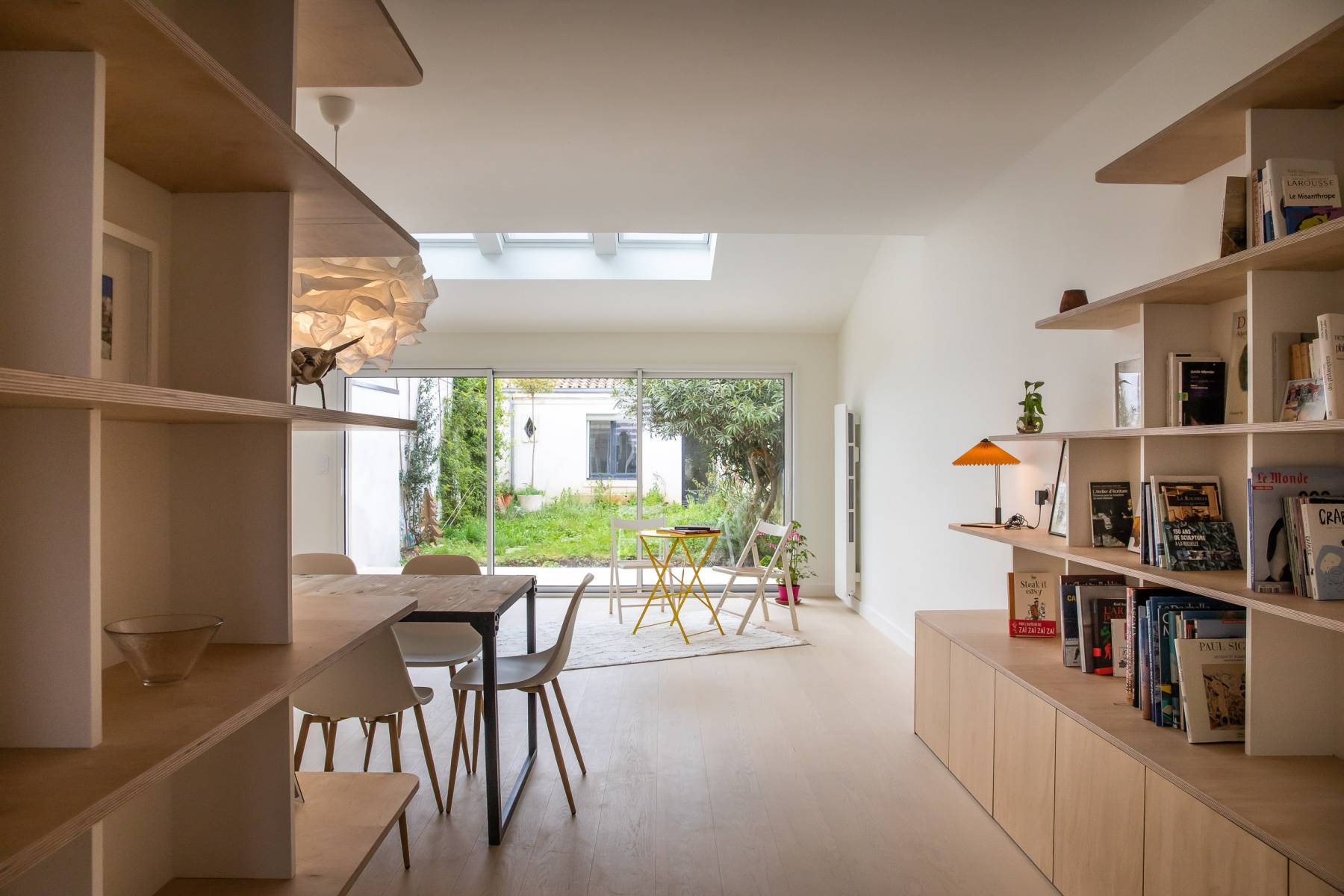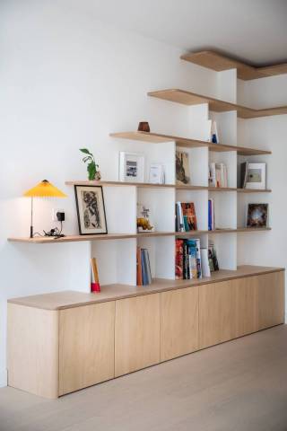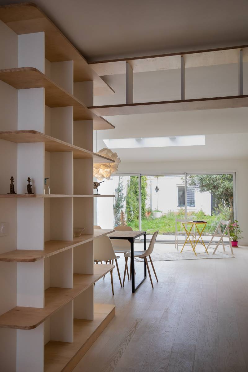 L'objectif principal de l'intervention est de créer une pièce de vie ouverte et lumineuse où les usages sont répartis dans un cheminement fluide, tout en agrémentant la maison de rangements pour l'importante collection de livres de la propriétaire.